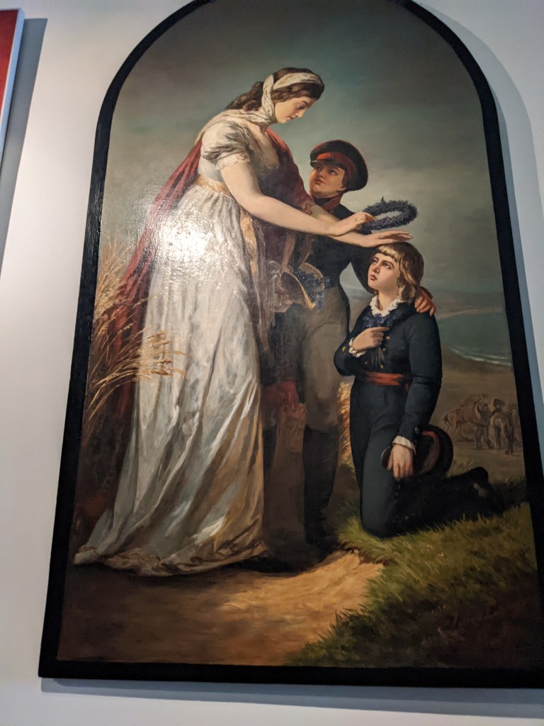 This is an 1888 painting by Julius Langer. Queen Luise of Prussia with Prince Wilhelm (1797-1888) and Crown Prince Friedrich Wilhelm (1795-1861). The caption reads: “This painting, made in the year in which the emperor died, shows young Wilhelm after having fled from Napoleon in 1806-07. His mother Luise, hailed as an opponent of Napoleon, is shown symbolically adorning Wilhelm with “Prussian-blue cornflowers, as if she already knows that it will be he rather than his older brother who will unite Germany under Prussian leadership.”