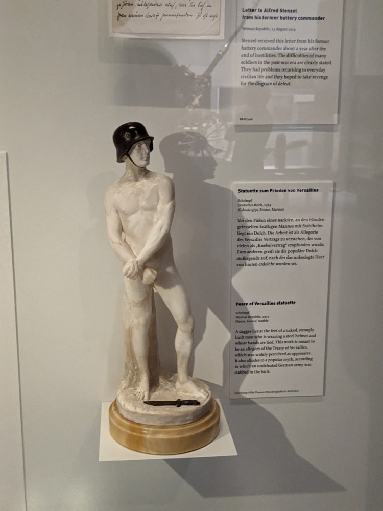 Peace of Versailles Statuette. Schrimpf, 1919. The caption reads, “A dagger lies at the feet of a naked, strongly built man who is wearing a steel helmet and whose hands are tied. This works is meant to be an allegory of he Treaty of Versailles, which has widely perceived as oppressive. It also alludes to a popular myth, according to which an undefeated German army was stabbed in the back.”