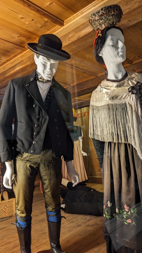 When we perform for the general public, the Vorplattler (the male lead dancer) often explains to the crowd that what the men are wearing is actually a hunting costume. They can vary a lot depending on the region they represent. In the evenings, young men would return to the villages and, naturally, want to meet up with young women. They would wear these attractive outfits, complete with all the accoutrements that proved they were strong, capable, and possibly, wealthy. Often these would be pins and awards from hunting or other competitions. And don’t forget a feather or a Gamsbart!