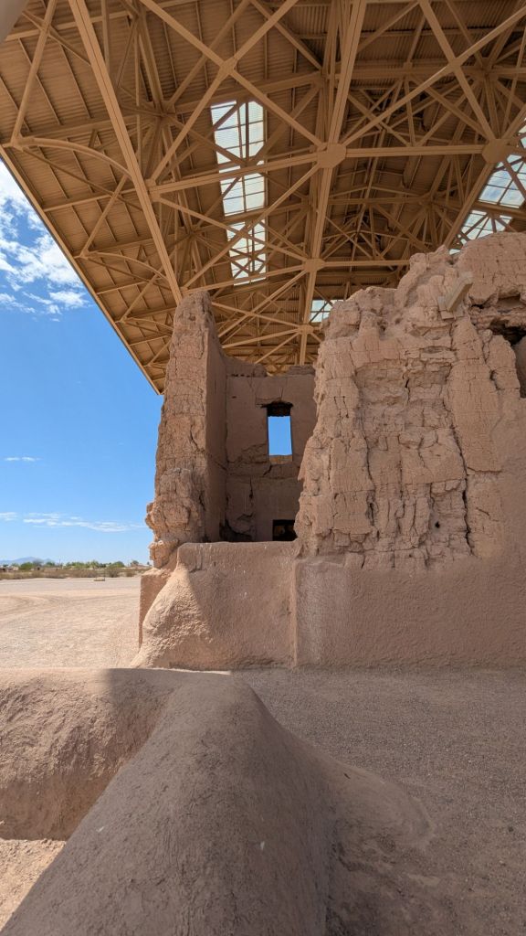 This structure is called Casa Grande, named by a missionary in the 1800s. It was once the central building in a large settlement of native peoples. There is still a bit of a mystery as to what happened to the group who settled here. It is believed that their “disappearance” could’ve been due to a cycle of flooding/drought that made irrigation and planting no longer feasible. It is also possible they overfarmed their land, that their success, as it were, was their downfall (this is from the film shown in the guest center). There also may’ve been some kind of crisis in leadership.